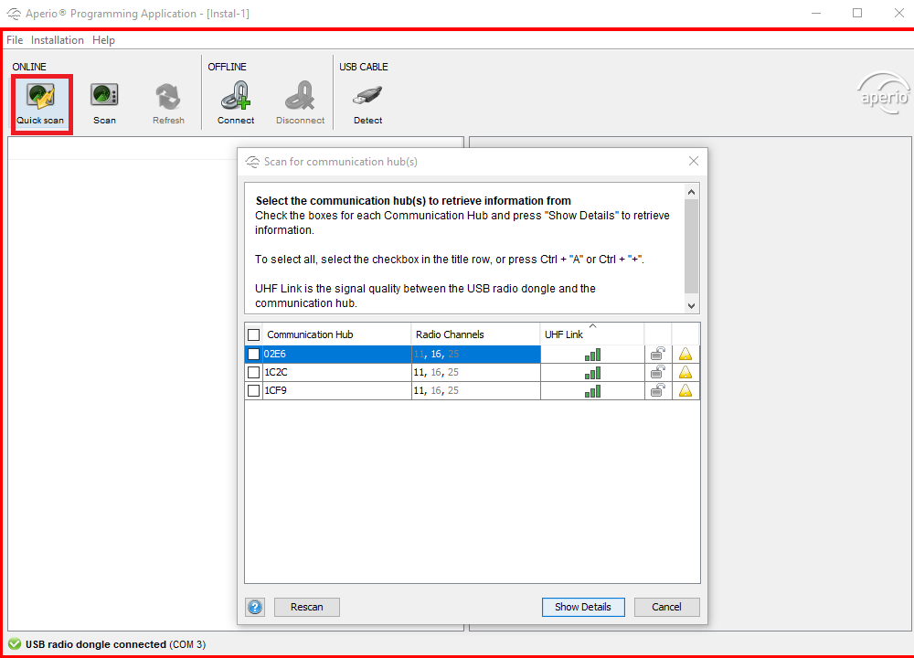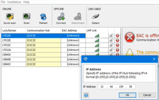 - If the installation is already created, select Quick scan to search for communication hubs within range. The hubs are identified by the last 3 bytes of their MAC address.