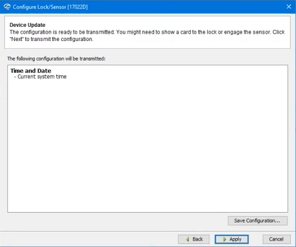 - Device Update: Select Apply to transmit the configuration to the device. If you save a configuration, it can be applied to other devices. This function is available on the Lock/Sensor menu and Communication Hub menu and will only download settings that apply to the hardware selected. Select Save Configuration to open the Save Configuration dialog to save the configuration in local storage for later use.