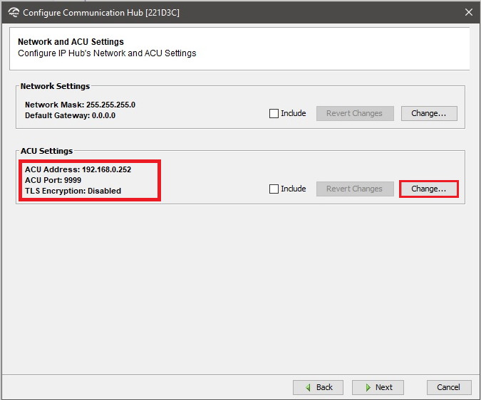 In the ACU Settings section, select Change to open the ACU Settings dialog. If TLS encryption should be used for communication, select Enable TLS. Select OK. (Refer to TLS Setup for the Hubs for instructions.)