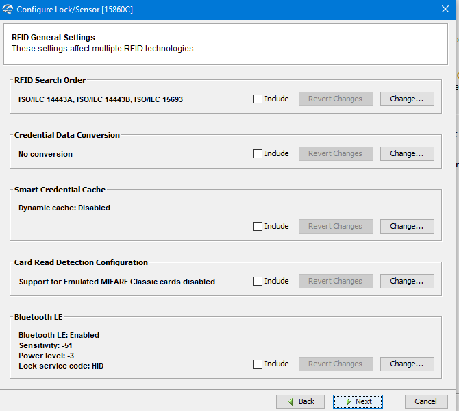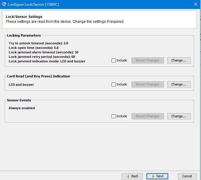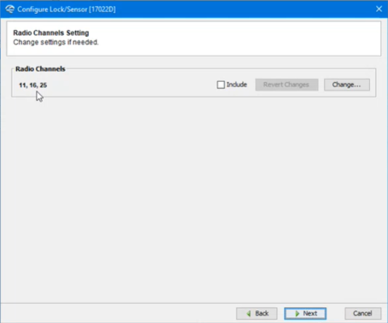 All locks assigned to a hub should be configured for the same radio channel.- Lock/Sensor Settings: Select Next to accept the default values: