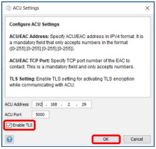 - Make sure Enable TLS is selected on the ACU Settings screen. Select Change to open the ACU Settings, and then select Enable TLS. Select OK.