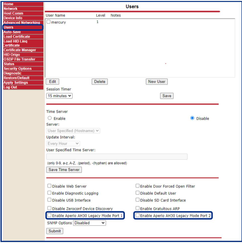 To enable this functionality, navigate to the Users page of the Controller web page and select the Enable AH30 Aperio Legacy Mode check boxes for the required ports. When enabled, the controller will automatically re-map any define AH30 Gen 1-4 hubs (model number 55) to be the AH30 Gen 5 (model number 58).