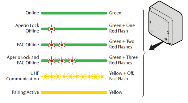 The communication hub has a status LED visible through the front cover. It supports optical schemes with red, green and yellow. The indication schemes are described by the figure below: