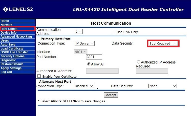 - Select the Host Comm link to display the Host Communication page.