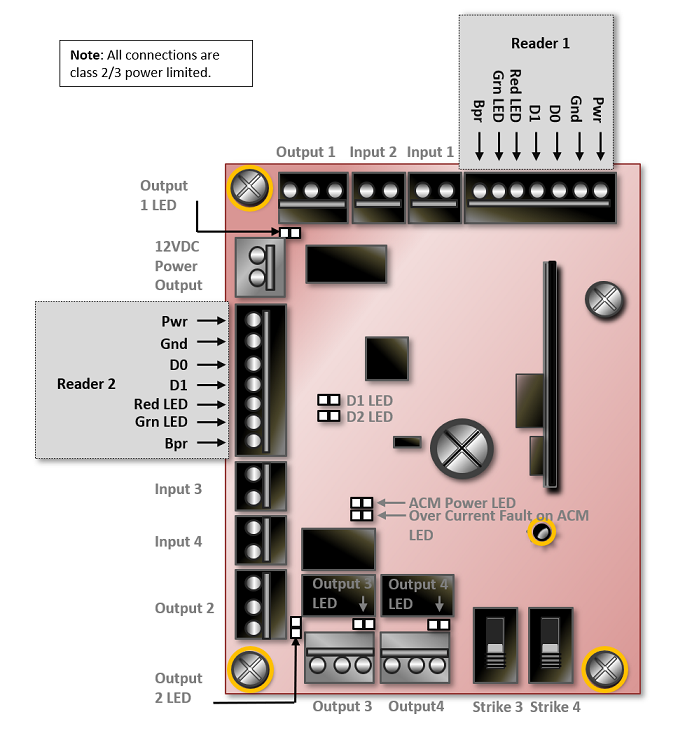 Up to four (4) input devices. Two of these can be 12V devices, such as Request to Exit devices and alarm sounders that are powered by MicroNode Plus.
