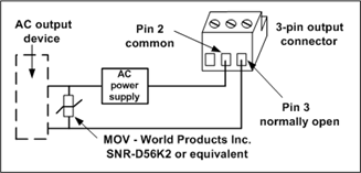 If the output device is AC powered and normally closed, install a varistor (40 VAC, 56 VDC, 10 A Surge, Radial Leaded Varistor or equivalent, such as World Products Inc. SNR-D56K2) in the circuit: