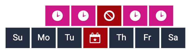 Visualization: The clock icon indicates intervals when the schedule runs. Wednesday is shown as a holiday (denoted by a red calendar icon) and the schedule will not run at 8 PM (denoted by the red strike icon).
