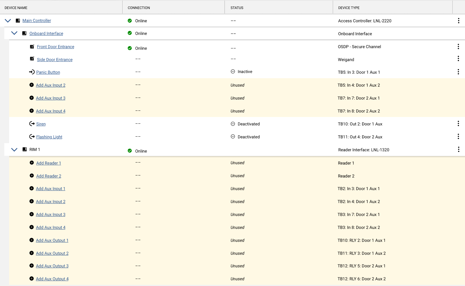 When access controllers and reader interfaces are added, the system automatically includes available reader, input, and output slots for them based on the number of readers, inputs, and outputs supported.