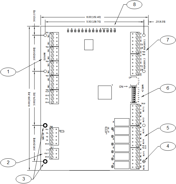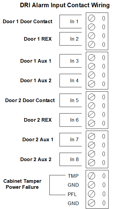 There are eight (8) inputs that are typically used to monitor door position, request to exit, or alarm contacts. Input circuits can be configured as: