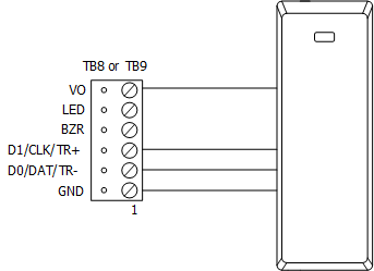 Each reader port supports a reader with TTL (D1/D0, Clock/Data), or 2-wire RS-485 signaling. Power to the reader is selectable: 12 VDC (VIN must be greater than 20 VDC), or power is passed-through (PT) from the input voltage of the LNL-1320 (TB7-VIN), 300 mA maximum per reader port. Readers that require different voltage or have high current requirements must be powered separately. (Refer to the reader manufacturer specifications for cabling requirements.) In the 2-wire LED mode, the buzzer output is used to drive the second LED. Reader port configuration is set via the host software.