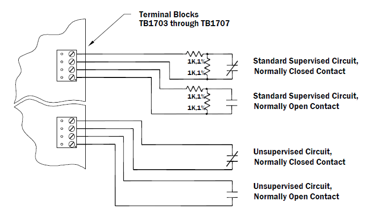There are eight (8) inputs that are typically used to monitor door position, request to exit, or alarm contacts. Input circuits can be configured as unsupervised or supervised. When unsupervised, reporting consists of only the open or closed states. When configured as supervised, the input circuit will report not only open and closed, but also open circuit, shorted, grounded, and foreign voltage. A supervised input circuit requires two resistors be added to the circuit to facilitate proper reporting. The standard supervised circuit requires 1k ohm, 1% resistors and should be located as close to the sensor as possible. Custom end of line (EOL) resistances may be configured via the host software.