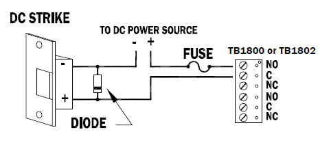 - For 12 VDC or 24 VDC strike, diode 1N4002 (100V/1A) typical.