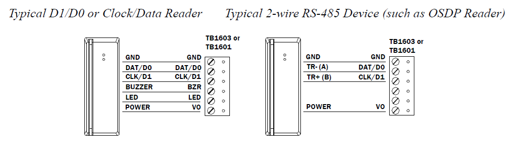 12 to 24 VDC ± 10% (input voltage (VIN) passed through), 600 mA maximum each reader port - Data Inputs: TTL compatible or 2-wire RS-485