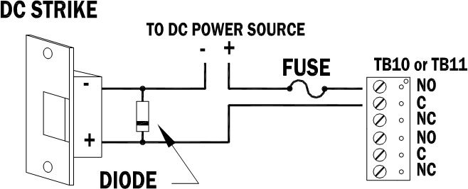 Four relays with Form-C contacts (dry) are provided for controlling door lock mechanisms or alarm signaling. Each relay has a Common pole (C), a Normally Open pole (NO) and a Normally Closed pole (NC). When controlling the delivery of power to the door strike, the Normally Open and Common poles are typically used. When momentarily removing power to unlock the door, as with a magnetic lock, the Normally Closed and Common poles are typically used. Check with local building codes for proper egress door installation.