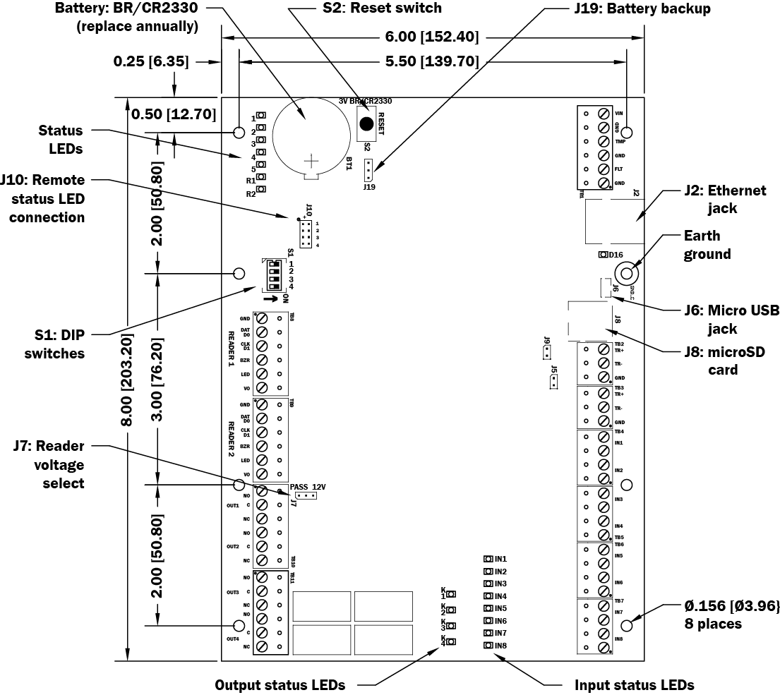 - Power: (jumper selectable) 12 VDC ± 10% regulated, 300 mA maximum each reader (input voltage (VIN) must be greater than 20 VDC) or 12 to 24 VDC ± 10% (input voltage (VIN) passed through), 300 mA maximum each reader