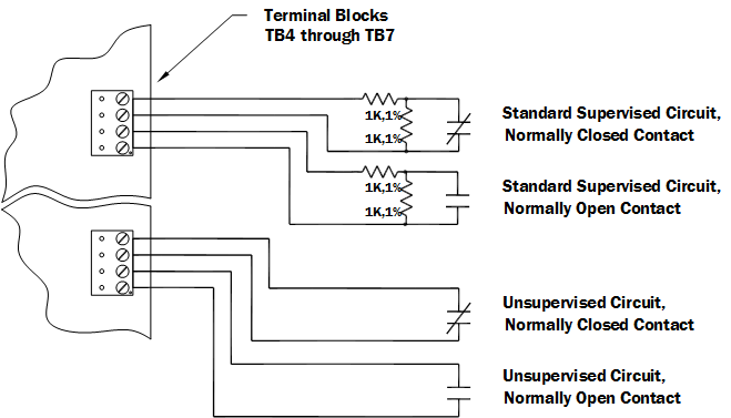 There are 8 inputs that are typically used to monitor door position, request to exit, or alarm contacts. Input circuits can be configured as unsupervised or supervised. When unsupervised, reporting consists of only the open or closed states. When configured as supervised, the input circuit will report not only open and closed, but also open circuit, shorted, grounded, and foreign voltage. A supervised input circuit requires two resistors be added to the circuit to facilitate proper reporting. The standard supervised circuit requires 1k ohm, 1% resistors and should be located as close to the sensor as possible. Custom end of line (EOL) resistances may be configured via the host software.