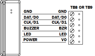 Each reader port supports a reader with TTL (D1/D0, Clock/Data) or 2-wire RS-485 signaling (OSDP reader for example). Power to the readers is selectable: 12 VDC (VIN must be greater than 20 VDC), or power is passed-through (PASS) from the input voltage of the LNL-X4420 (TB1-VIN), 300 mA maximum per reader port. Readers that require different voltage or have high current requirements must be powered separately. Refer to the reader manufacturer’s specifications for cabling requirements. In the 2-wire LED mode, the buzzer output is used to drive the second LED. Reader port configuration is set via the host software. Do not terminate any RS-485 devices connected to a reader port.