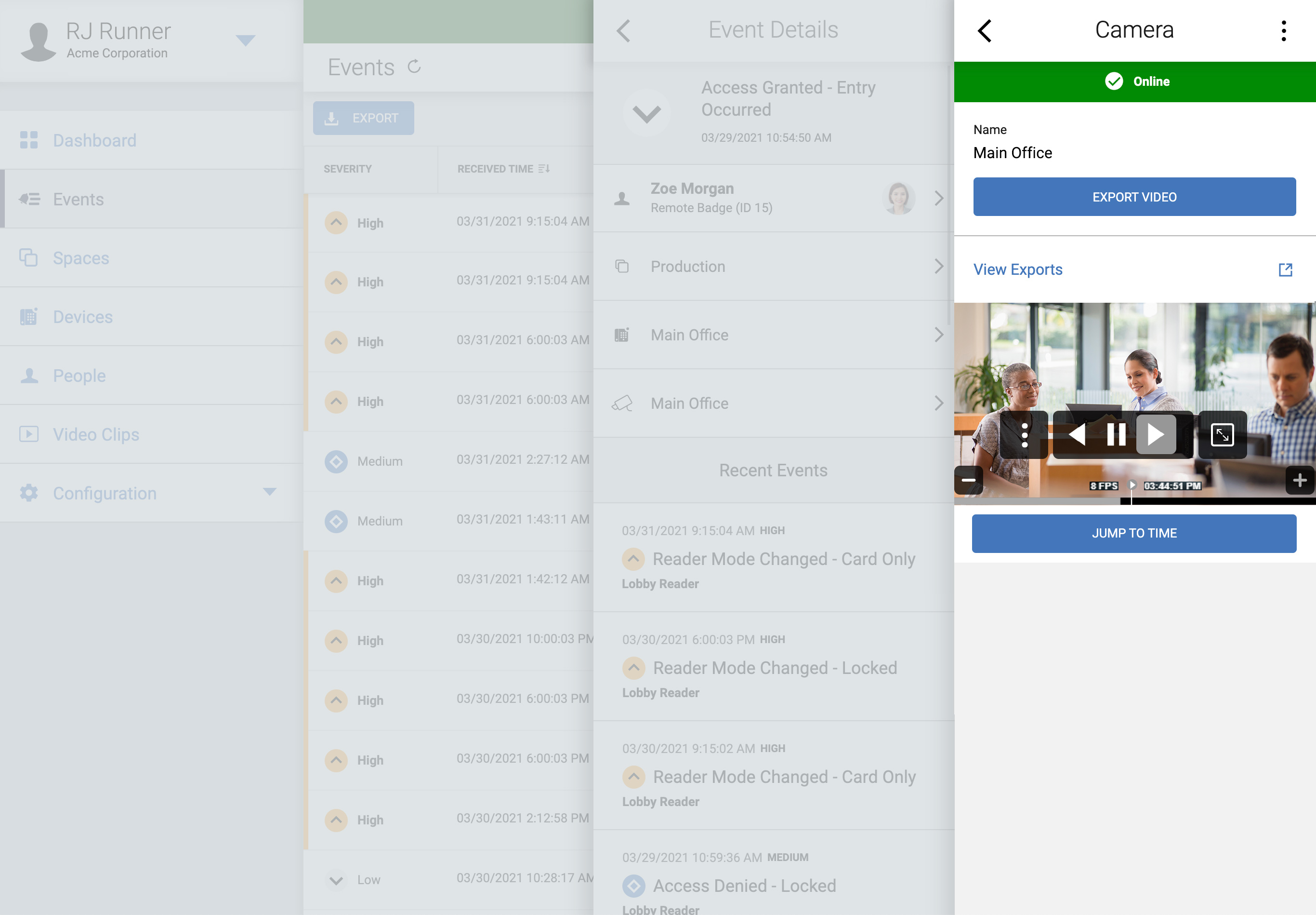 - Associate video with events and view live/recorded video from the Events menu