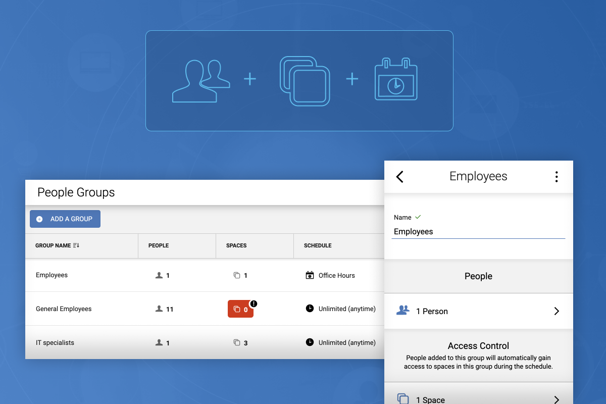 People groups is a much easier way of assigning and managing access to your readers. Group people together and easily assign access to one or more spaces, and optionally limit that access based upon a schedule.